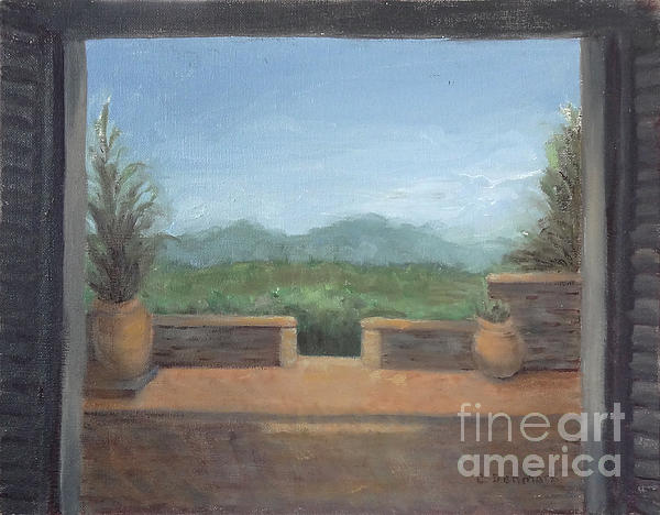 This view is from the terrace of Mona Lisa's family home outside Florence looking out over their olive groves . It was a timeless and beautiful setting . I was in the tasting room sampling their olive oil products and looked out and saw this wonderful view framed by the shutter doors that still looked much the same as I think it did a long time ago.